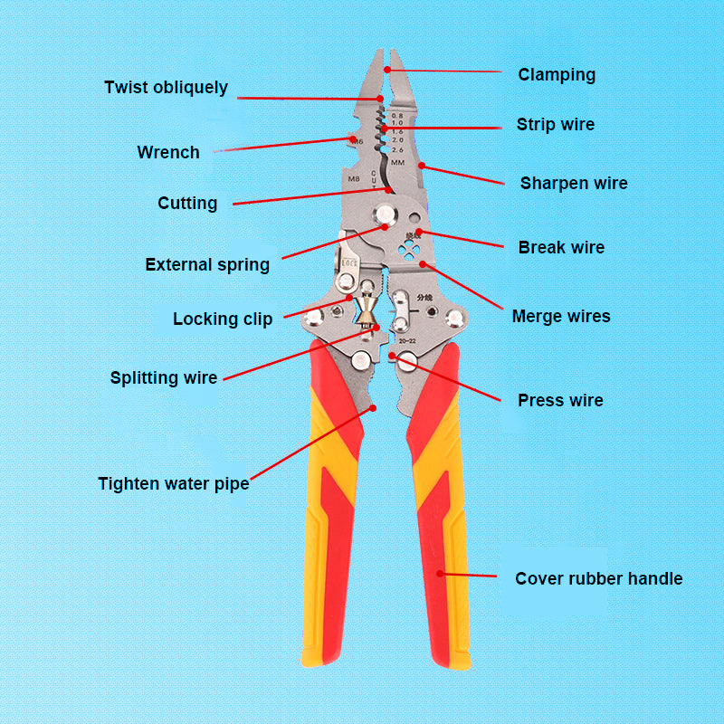 This foldable 12-in-1 universal wire stripper integrates multiple functions, specifically designed for electricians and suitable for various wire handling tasks. It features functions such as wire stripping, cutting, twisting, and crimping, meeting the diverse needs of electricians in their daily work. The foldable design makes the tool more portable and easy to store, saving space and offering greater convenience.