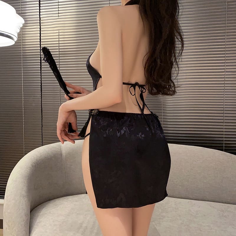 Turn up the heat with this sexy cheongsam-inspired lingerie set. Featuring a hollow-out design, retro frog buttons, high slit, and open-back strappy style, it perfectly blends traditional elegance with modern allure. The figure-hugging cut accentuates your curves, while the bold cut-outs add irresistible charm. Paired with a matching thong, this outfit makes the ultimate choice for role play, private nights, or seductive surprises.