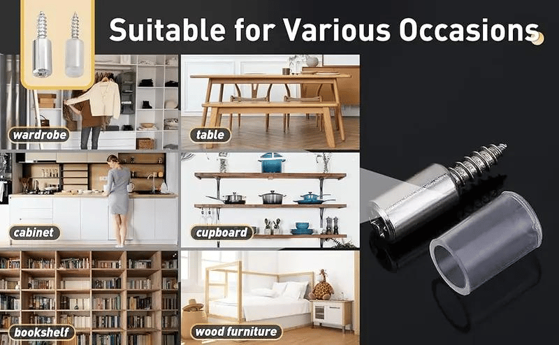 Forget complex tools or drilling extra holes. TheseĀ self-tapping screwsĀ make installation quick and beginner-friendly. Simply screw directly into your cabinet using a screwdriver or drill, and your shelves will be ready to hold weight instantly.
